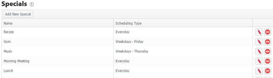 Specials are used to create recurring items for specific times on your calendar for classes like art, music, or gym. Specials can be scheduled to occur every day, or follow A/B, weekday, or